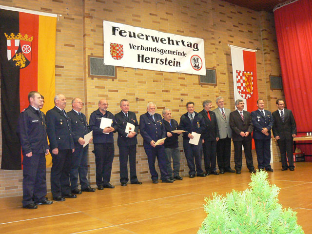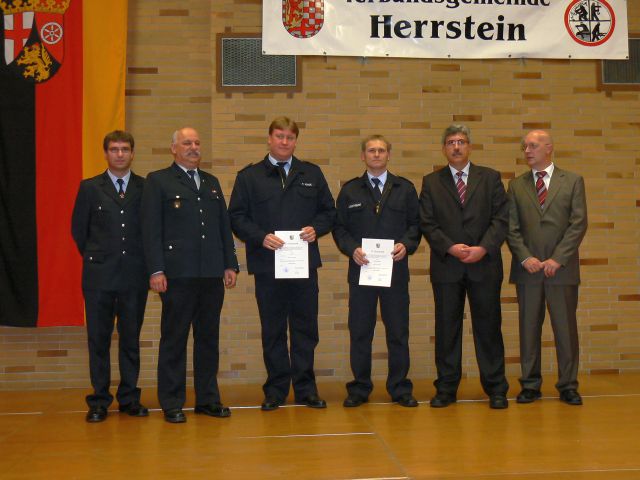 Vier angehörige der Feuerwehr Kirschweiler wurden befördert bzw. geehrt. Für 35-jährige aktive, pflichttreue Tätigkeit bei der Feuerwehr wurde Dietmar Fuhr und Manfred Storr das goldene Feuerwehr-Ehrenzeichen verliehen. Christian Theis wurde zum Oberfeuerwehrmann und Frank Noack zum Hauptbrandmeister befördert.