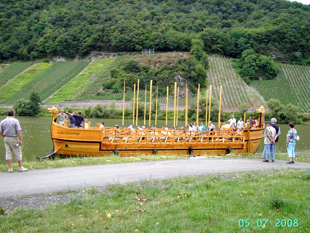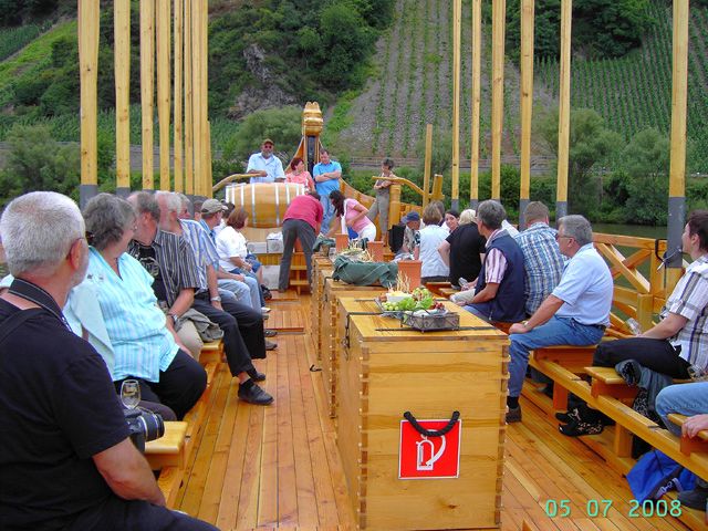 Zuerst ging es mit dem Bus in die Nähe von Leiwen (Mosel). Hier begann dann eine Wanderung über einem Rundweg Richtung Neumagen. In einem Weingut in den Weinbergen oberhalb des Ortes stärkten sich die Teilnehmer anschließend mit Kaffee und Kuchen. Nach dem Zwischenstopp wurde die Wanderung bis an das Moselufer in Neumagen fortgesetzt. Ab hier ging es dann mit dem Neumagener Weinschiff weiter. Das Weinschiff ist der Nachbau eines auf dem Grabmal eines römischen Weinhändlers dargestellten Schiffs aus der Zeit um 220 n. Chr. Während der Fahrt auf der Mosel wurde eine Weinprobe mit verschiedenen Moselweinen durchgeführt. Danach ging es dann in die Weinstube des Winzers. Hier wurde das Abendessen eingenommen. Dem krönenden Abschluss bildete dann der Besuch auf dem Weinfest in Piesport mit einem großen Feuerwerk.